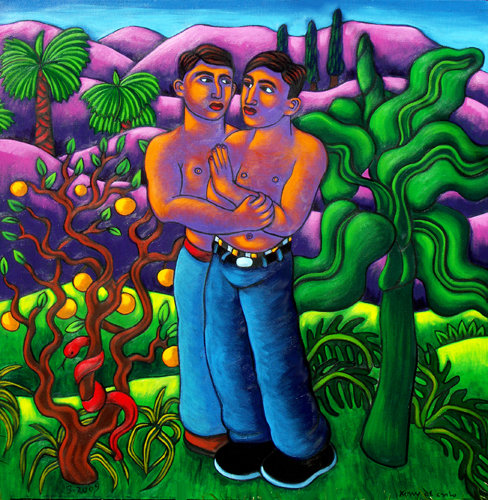 Tony de Carlo nace en Los Ángeles en 1956. Es hijo de una madre artista, quizás de allí le viene su gran talento que ha desarrollado desde su más temprana infancia. Tony es un artista autodidacta, es un dibujante maravilloso y un fabulista del color. Sus pinturas plasman imágenes de gran belleza donde se representa el encanto de la vida homoerótica, un ejemplo son sus casamientos gays, sus flores y jardines; pero también con su multiplural paleta y su gran imaginación puede representar el dolor y lo tortuoso de la vida gay cuando observamos los santos, especialmente sus “san sebastianos” o su obra dedicada a la muerte.